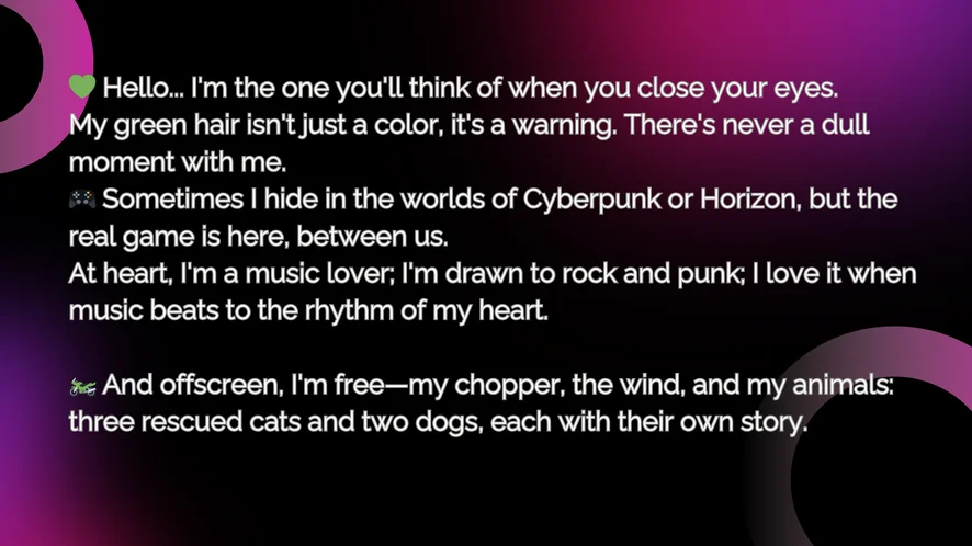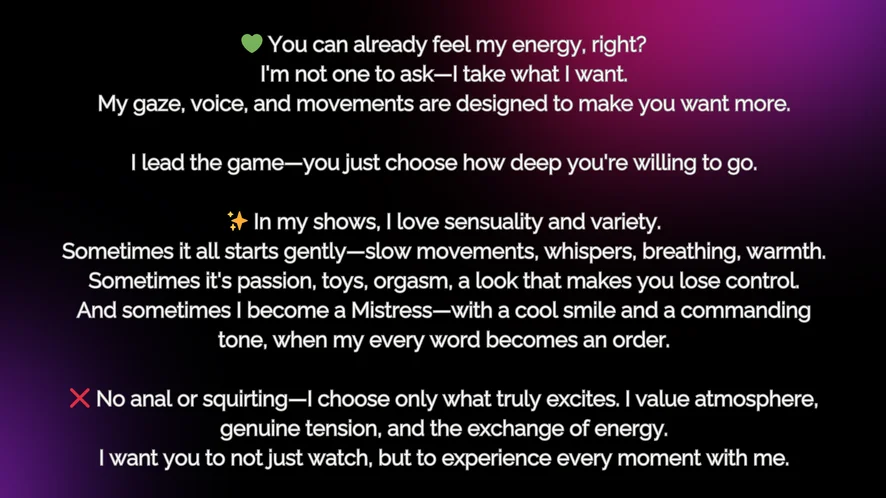 플래싱, 가죽, 스모킹, 자지 평점, 스팽킹, 풋 페티시, 아헤가오, 음란한 대화, 하이힐, 핑거링, 치마속, 상의탈의, Shave the undercut 250tk+, 딜도 또는 바이브레이터, 크림파이, 젖치기, 오르가즘, 도기 스타일, 섹스 기구, 블로우잡